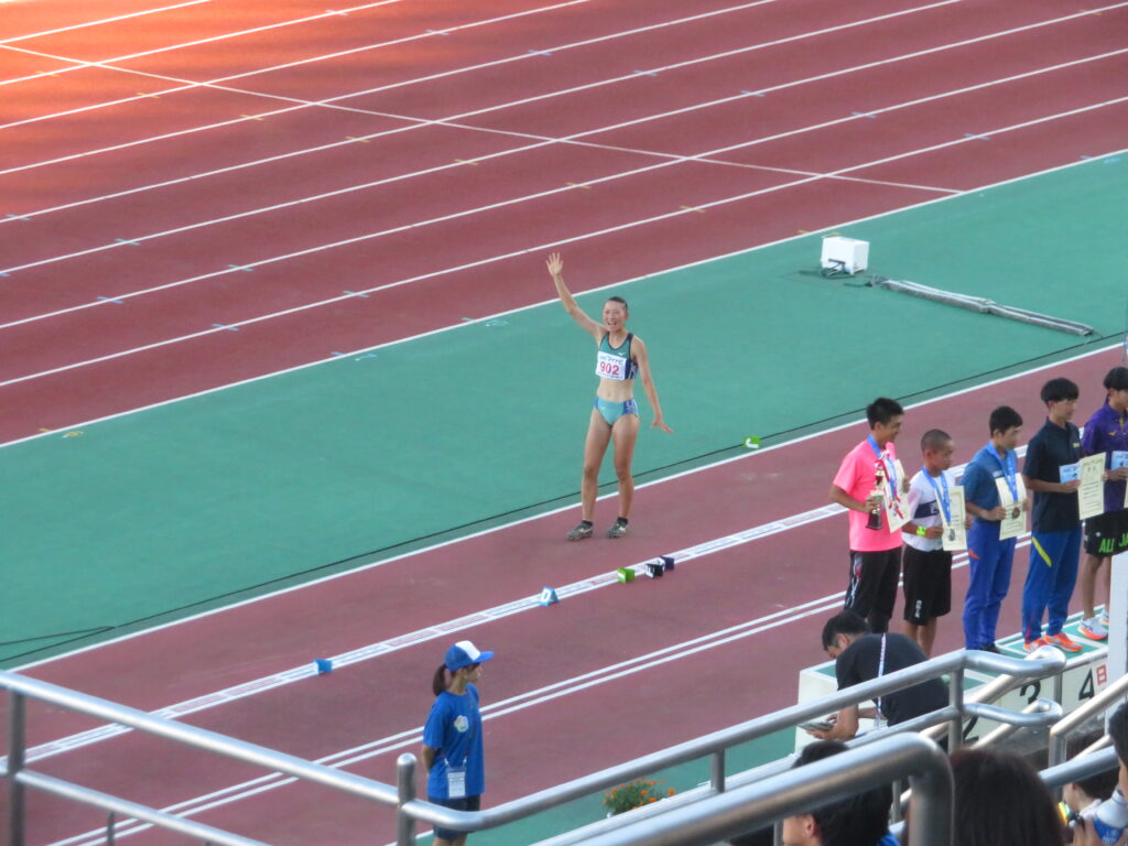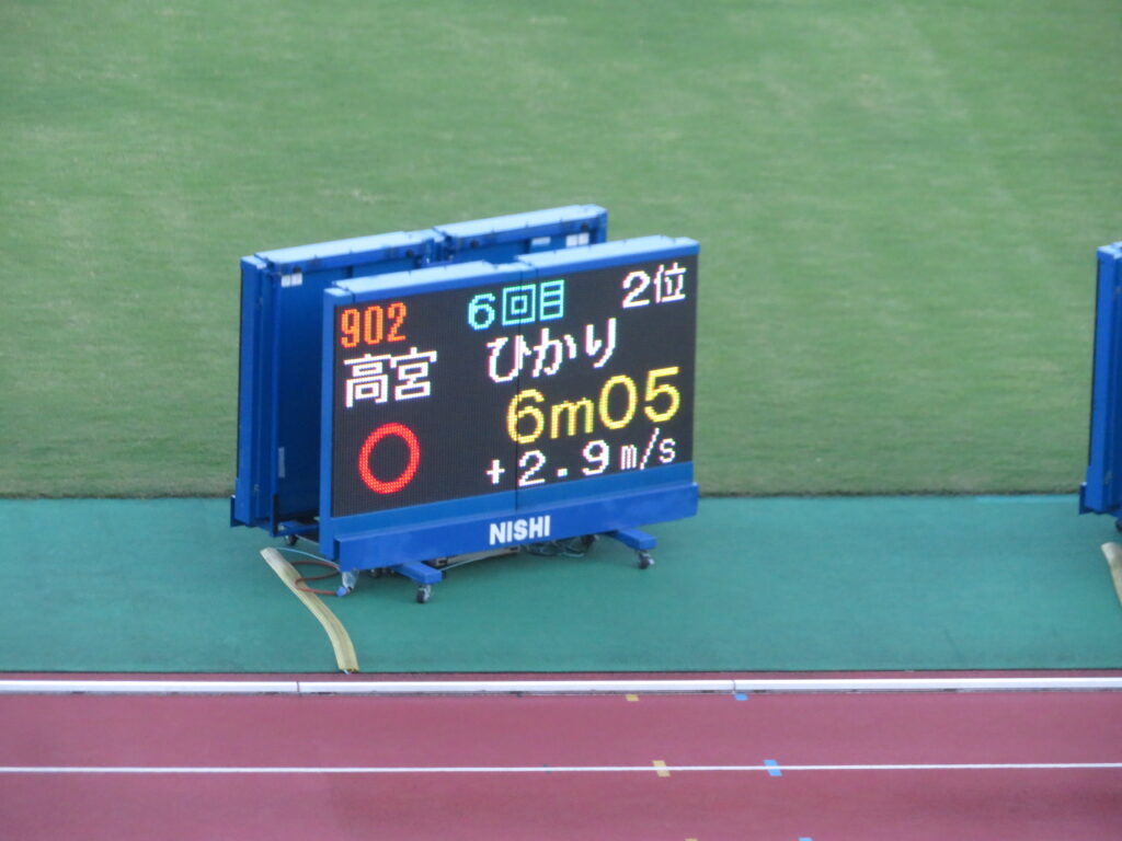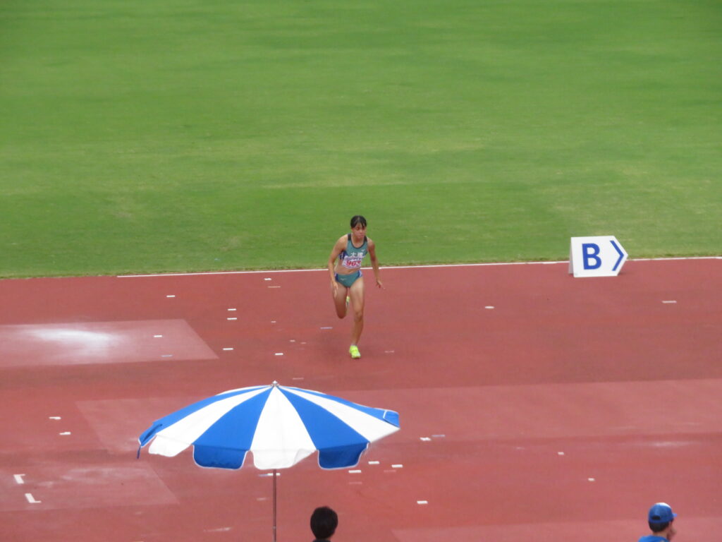 女子走り幅跳びでは、観衆を味方につけ波に乗った跳躍でした。特に3本目と6本目の集中力には感動しました。6m越えの選手が3人。その中の1人が高宮さんです。見事3位に入賞しました。明後日の三段跳びに向けて準備が整いました。
