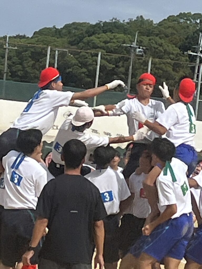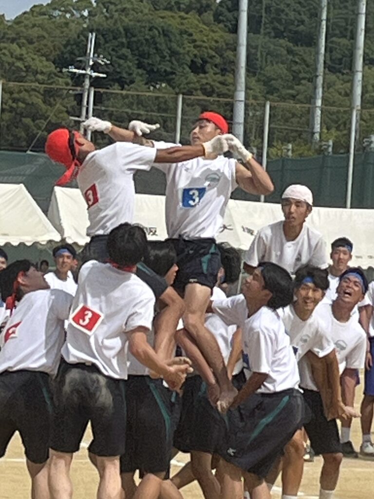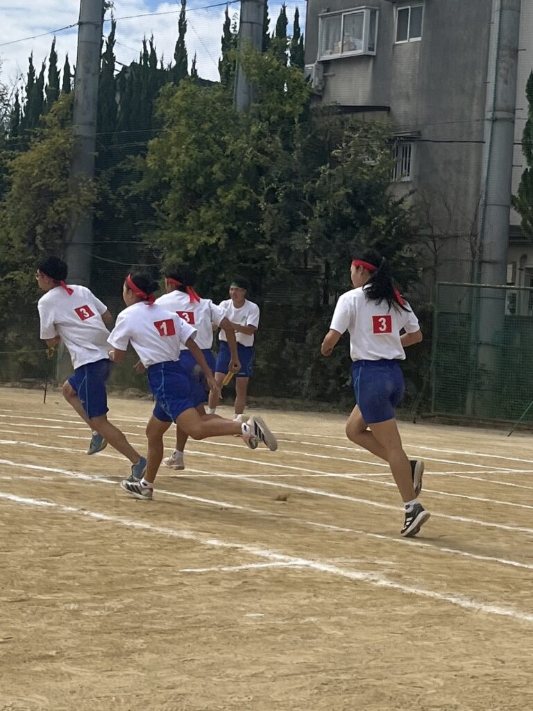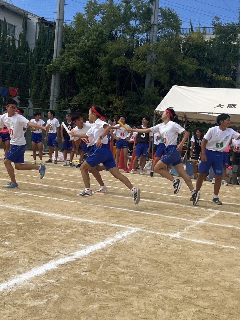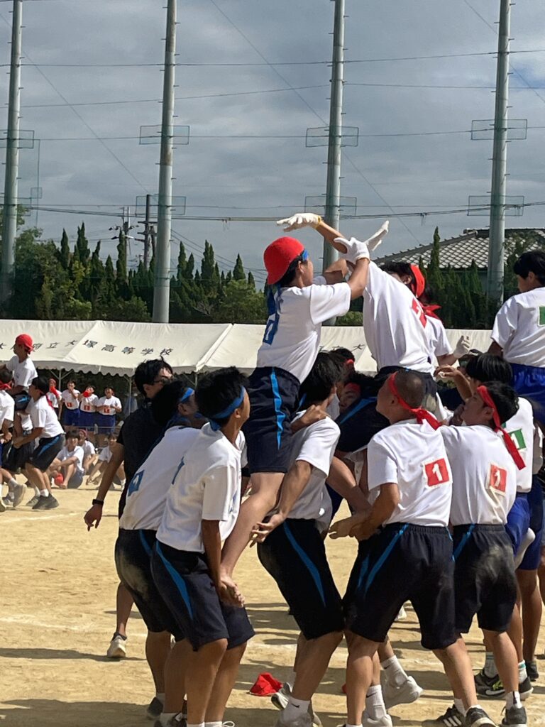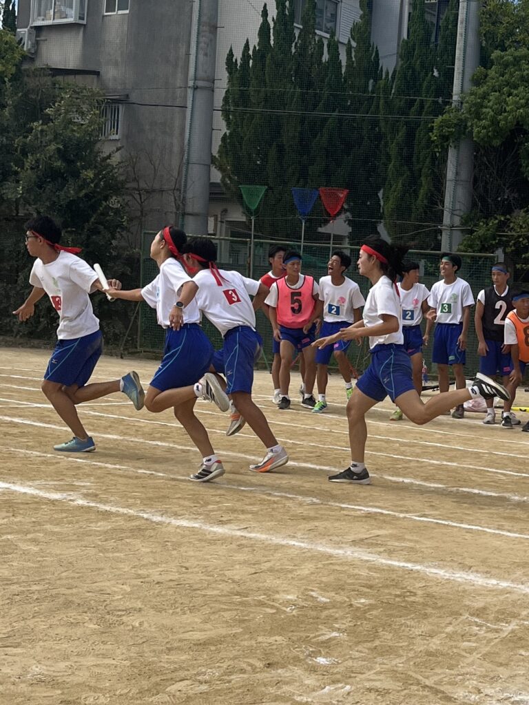 大塚際(体育の部) パート4 徐々にグランドも熱気を帯び、いい感じに盛り上がってきました! 次の種目はプログラムNo.6「騎馬戦」、そしてプログラムNo.7の「スウェーデンリレー」です。騎馬戦は見ごたえ十分。すごい迫力です。なので3年生男子の騎馬戦では、あまり過激にならないように競技の前に集めて注意、少し間をとり落ち着かせてから競技を開始しました! スウェーデンリレーは1走が100m、2走が200m、3走が300m、4走が400mと走る距離が伸びていくハードな種目となっています!