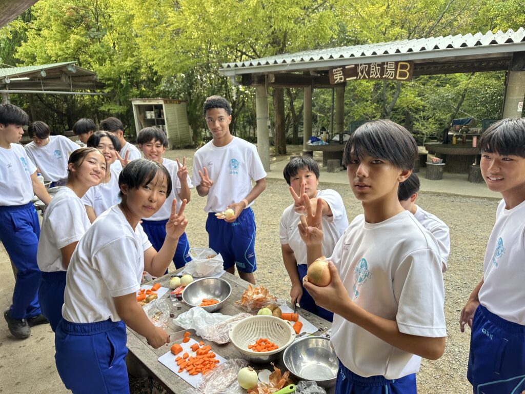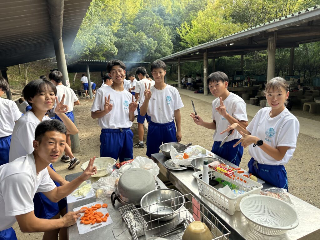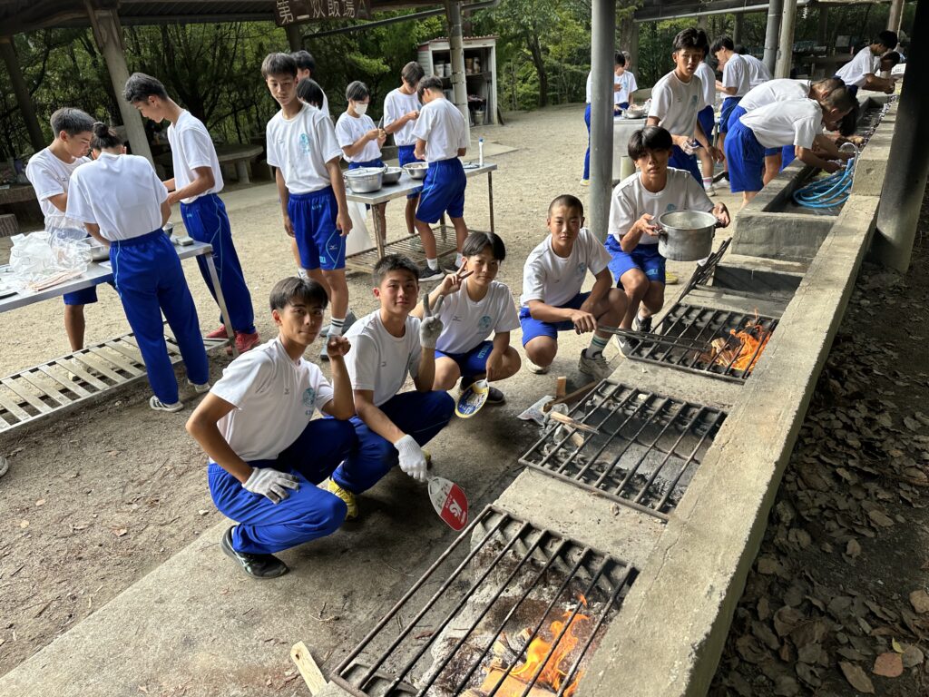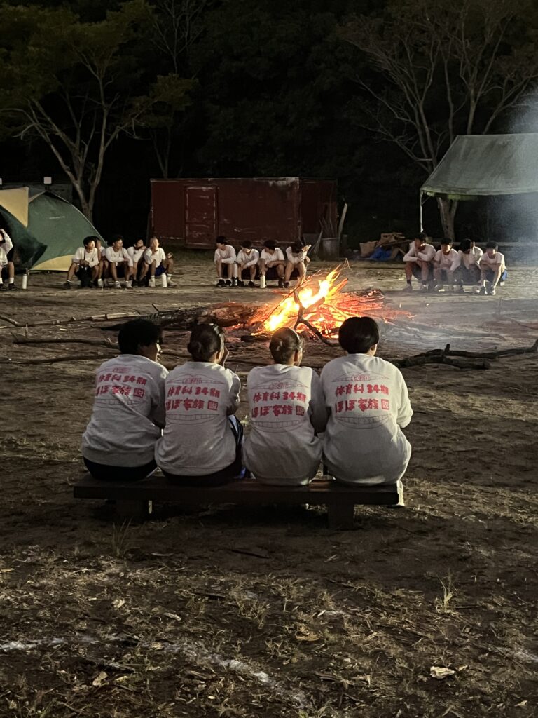 キャンプ実習② キャンプ実習2日目。朝食(焼きそばパン)のあと、和泉葛城山ハイキング! 山頂では大塚高校の食堂が用意してくれたお弁当を食べてクラス写真♪ 夕食はカレー。水の量がポイントです♪ 具材にもしっかり火を通して♪ 夜はキャンプファイヤー! 各班、趣向を凝らしたスタンツを披露♪ 指導員として大阪体育大学の学生さんにも来ていただき、楽しい夜となりました! 投稿ナビゲーション キャンプ実習①キャンプ実習③