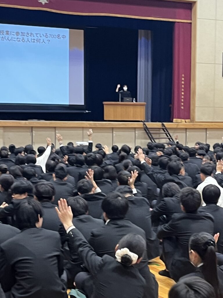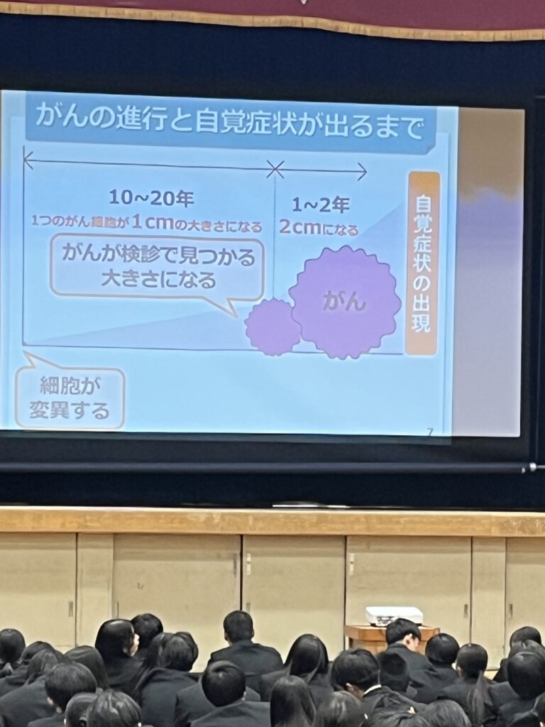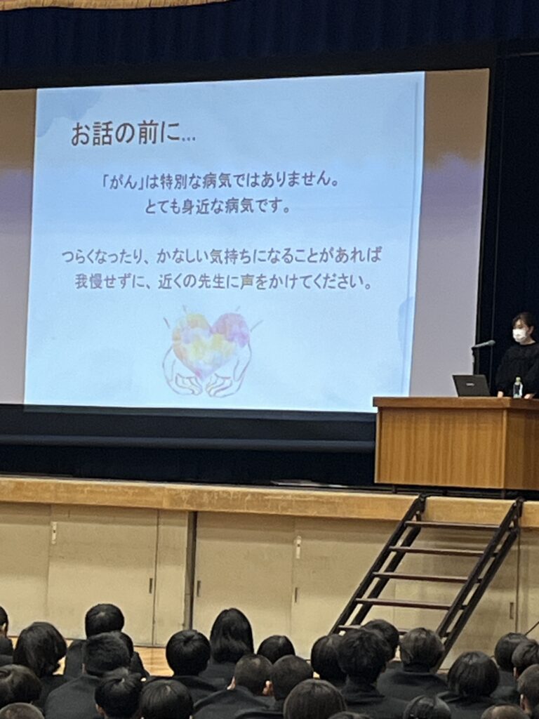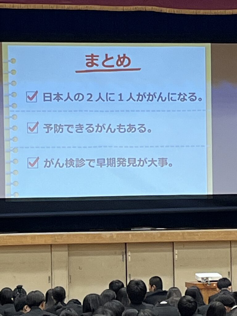 がん教育 10月30日(木)5限目に全校生徒を対象に「がん教育」を行いました。松原徳洲会病院から講師をお招きして、がんについて、その種類や特徴、予防などをわかりやすく解説していただきました。講師の 森 麻衣子 様は緩和ケア認定看護師でもあり、がん患者には心のケアも大切であることを学びました。生徒以上に先生方が前のめりに聞き入っていました!