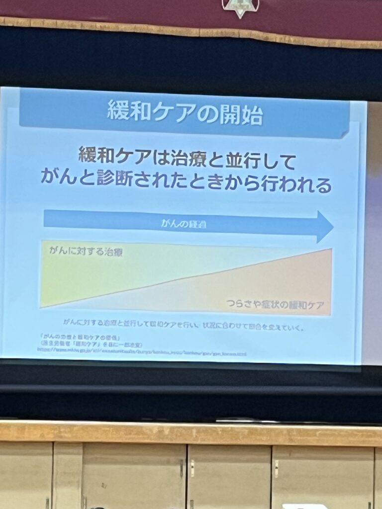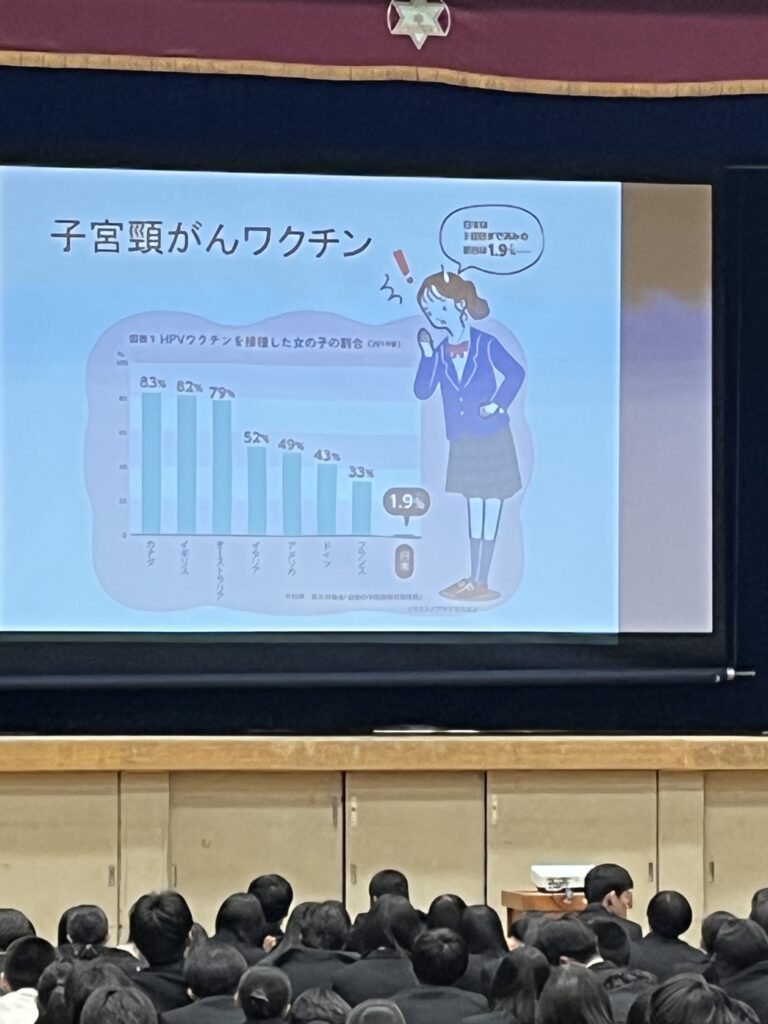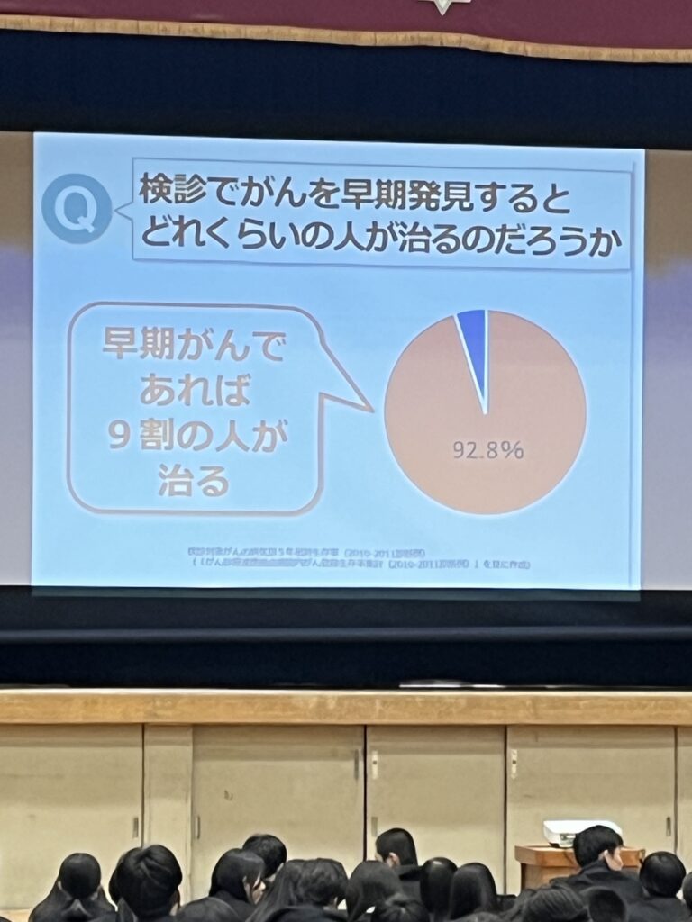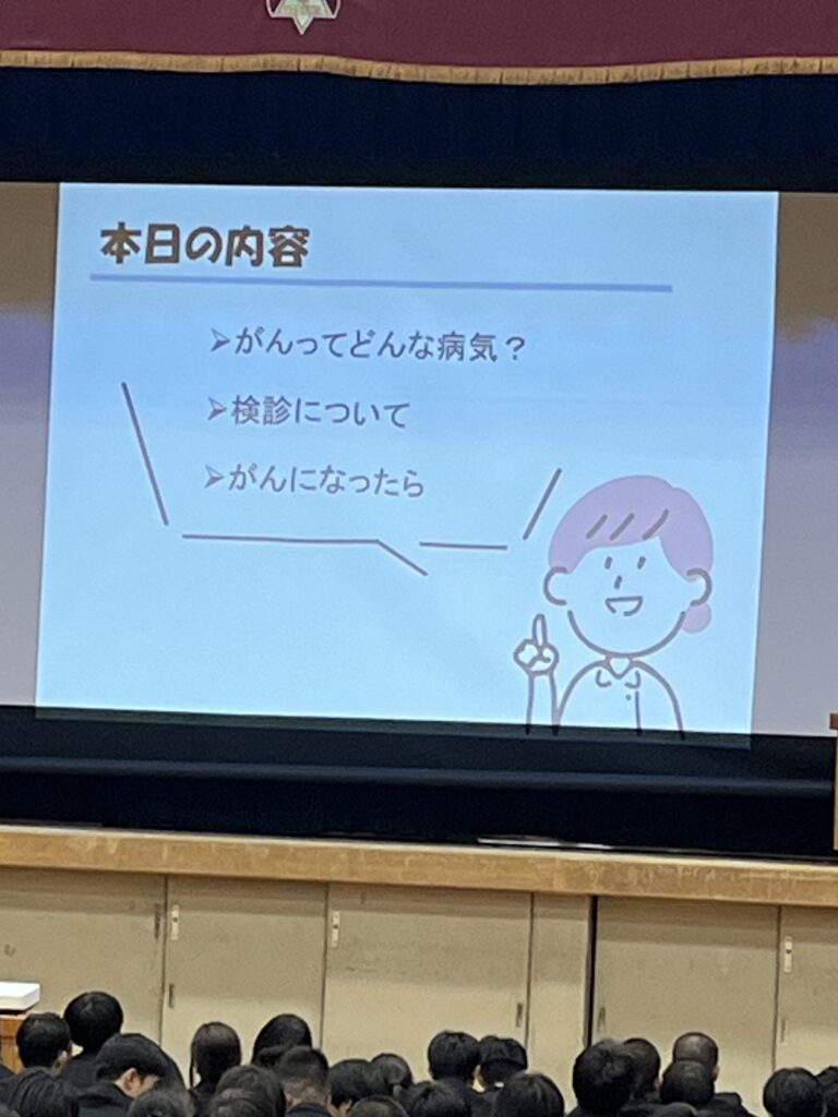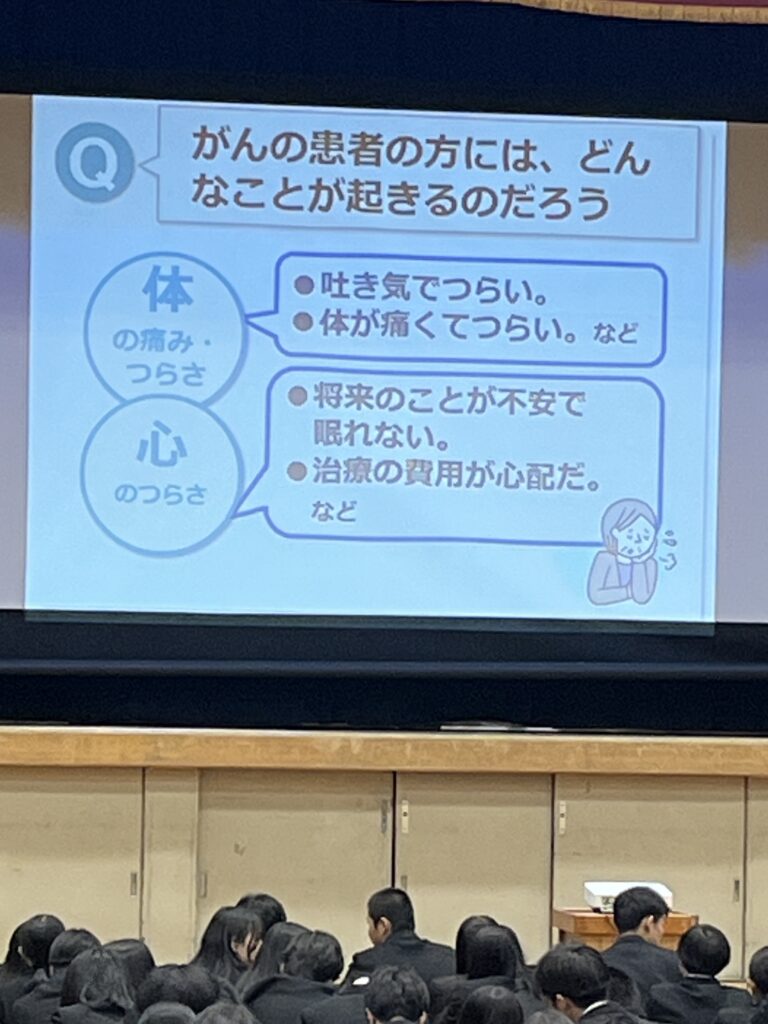 がん教育 10月30日(木)5限目に全校生徒を対象に「がん教育」を行いました。松原徳洲会病院から講師をお招きして、がんについて、その種類や特徴、予防などをわかりやすく解説していただきました。講師の 森 麻衣子 様は緩和ケア認定看護師でもあり、がん患者には心のケアも大切であることを学びました。生徒以上に先生方が前のめりに聞き入っていました!