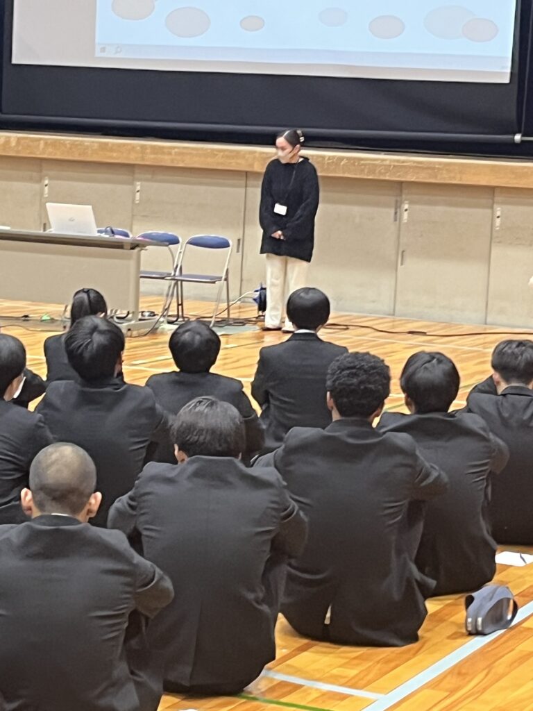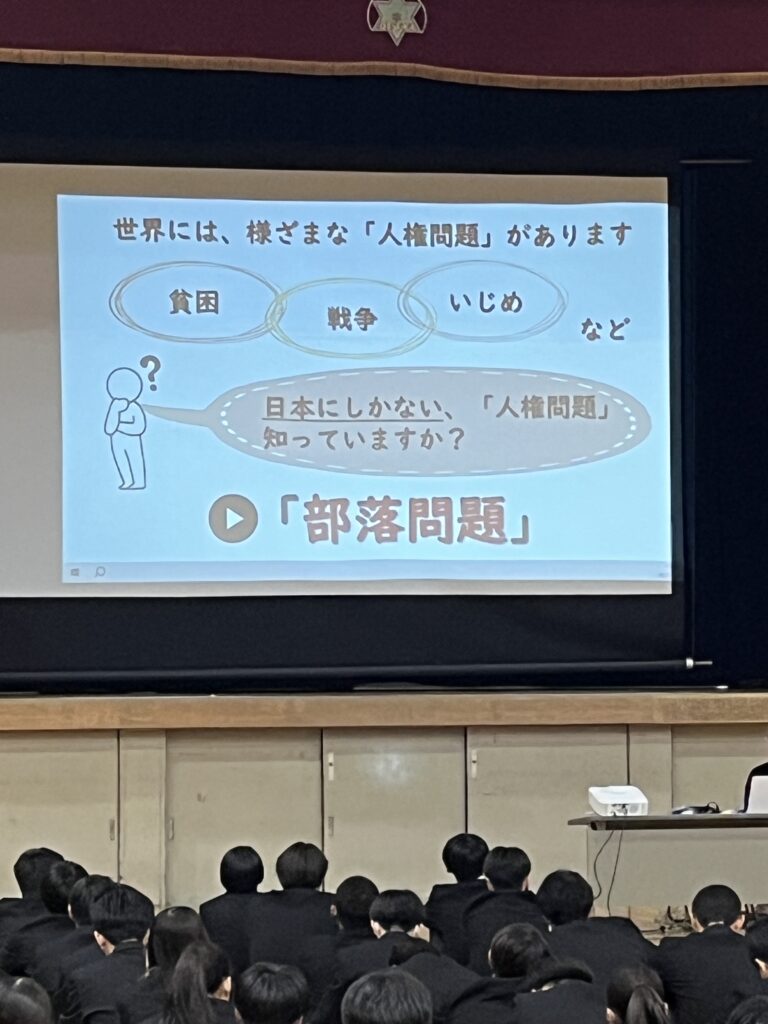 11月13日(木)、今年度2回目となる1年生(43期)対象の人権学習を行いました。今回の研修は同和問題について当事者の方の話を聞くことで同和問題に対する理解を深め、正しい人権感覚を養うことが目的です。堺市人権ふれあいセンターより講師として 米川真以さん をお招きし、自身の体験も踏まえた貴重なお話をいただきました。生徒たちも真剣な表情で話しに聞き入っていて学びの多い時間となりました。