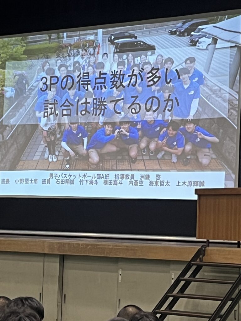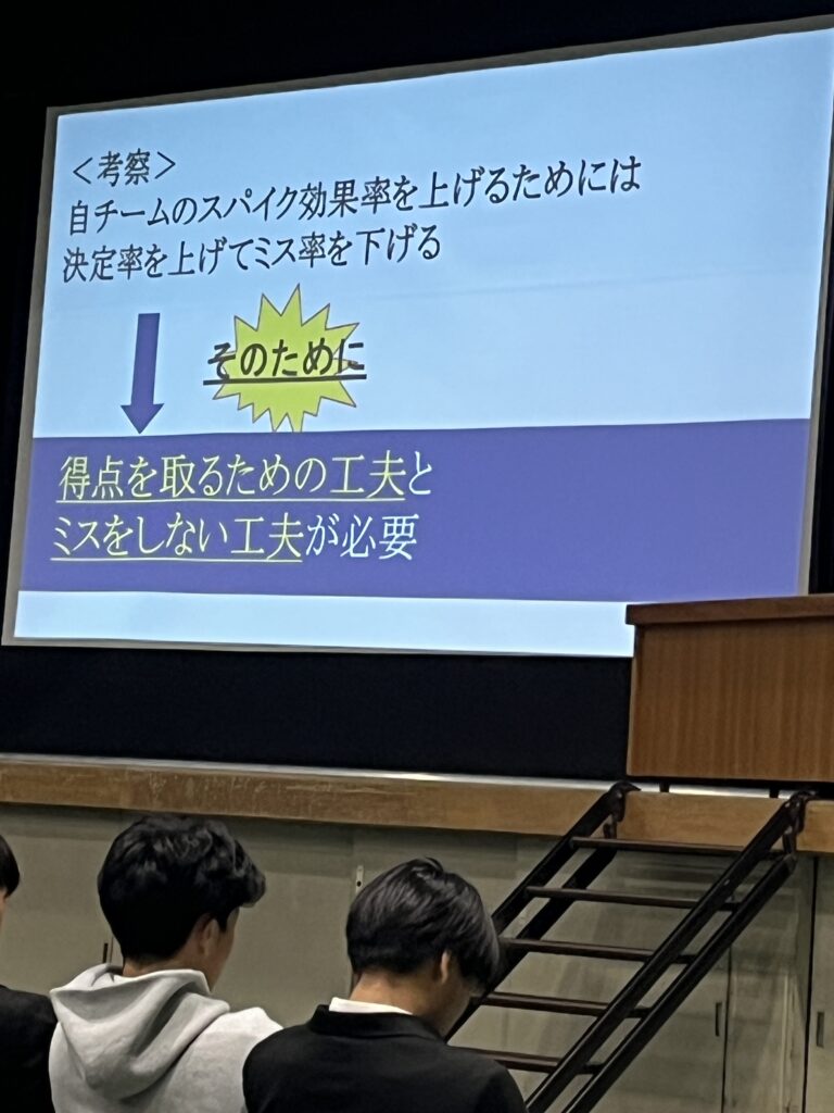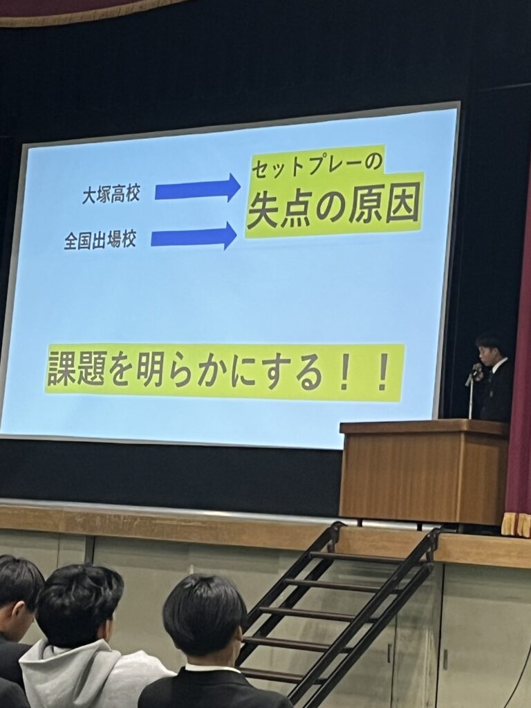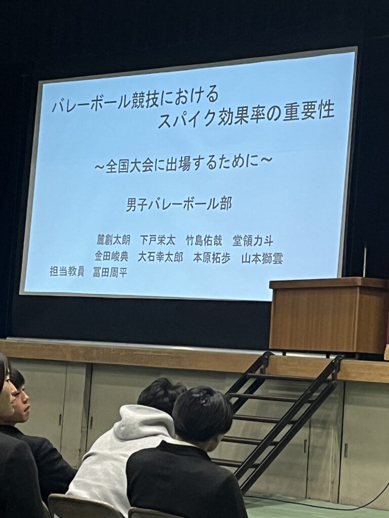 3年生は専攻研究発表の結果を自分の今後の競技生活に役立ててほしいと思います。また1、2年生も自分たちが専攻研究をする際の参考にするとともに、自分たちのチーム作りや競技力の向上に生かしてほしいと思います。最後になりましたが、お忙しい中、指導助言をいただきました、大阪府教育庁保健体育課 田中指導主事、大阪体育大学 石川教授のお二人には心より感謝いたします。ありがとうございました。