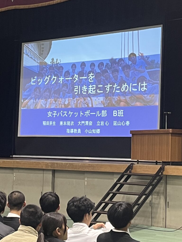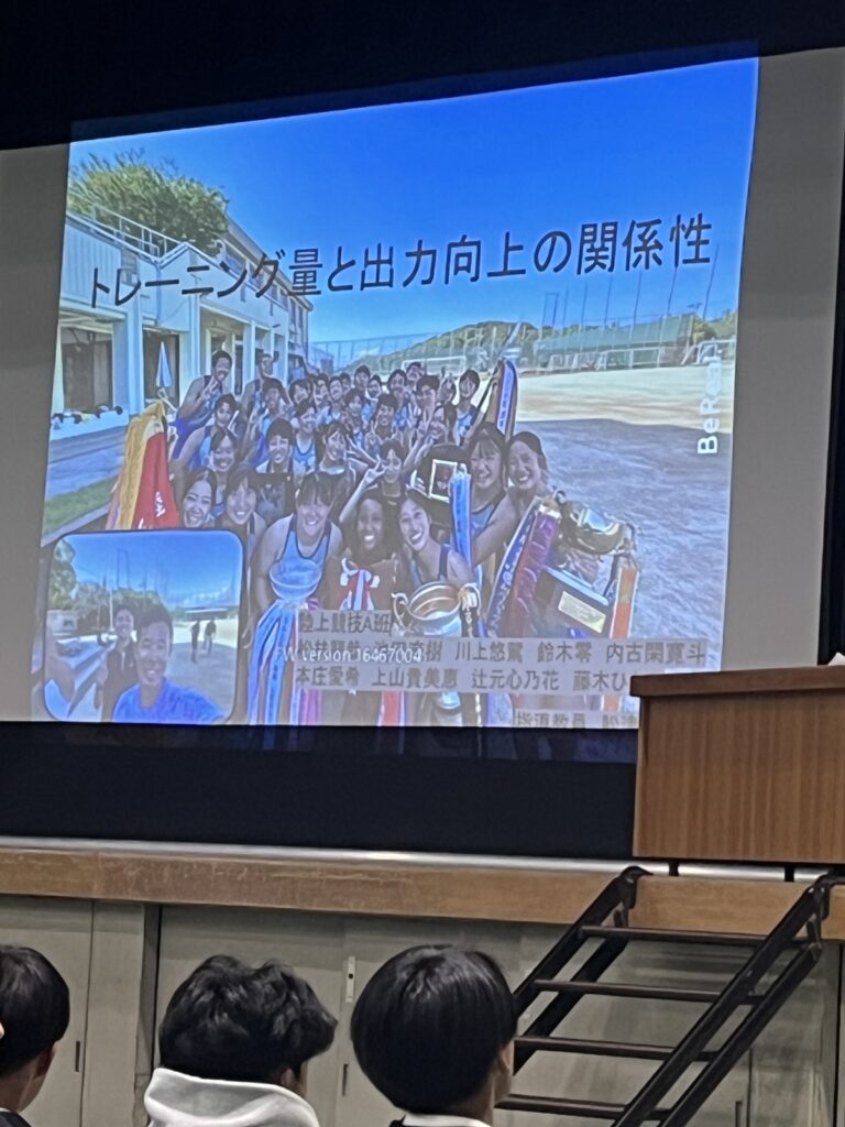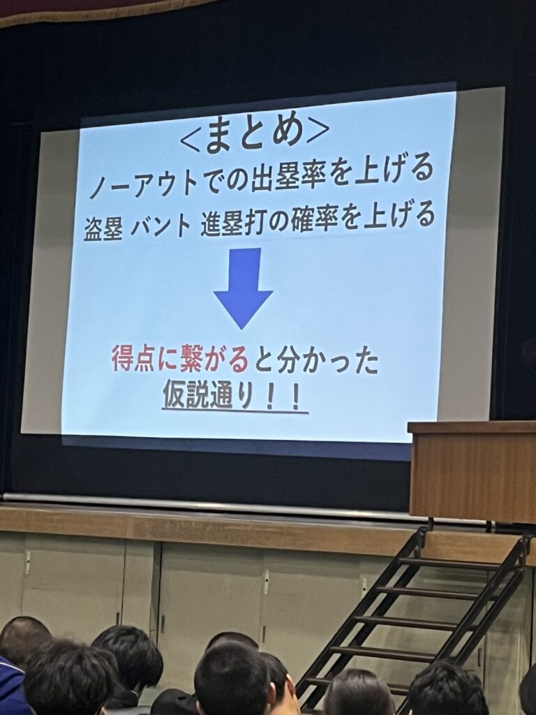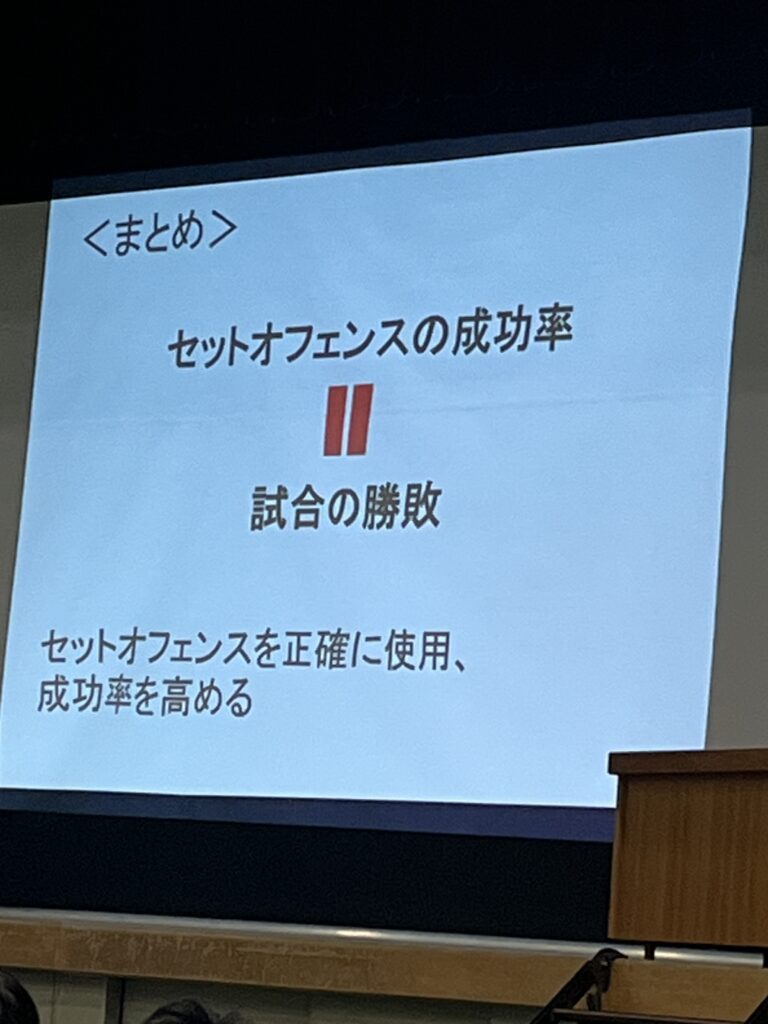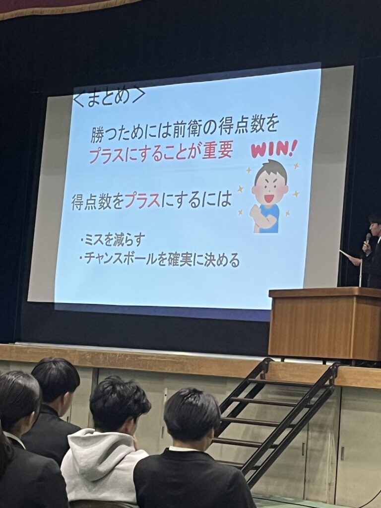 3年生は専攻研究発表の結果を自分の今後の競技生活に役立ててほしいと思います。また1、2年生も自分たちが専攻研究をする際の参考にするとともに、自分たちのチーム作りや競技力の向上に生かしてほしいと思います。最後になりましたが、お忙しい中、指導助言をいただきました、大阪府教育庁保健体育課 田中指導主事、大阪体育大学 石川教授のお二人には心より感謝いたします。ありがとうございました。
