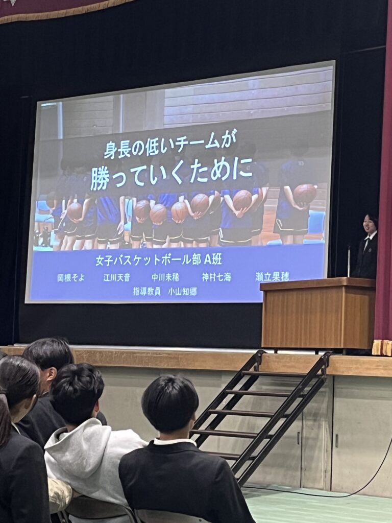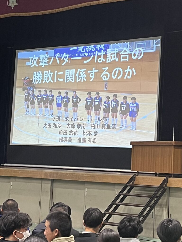 1月16日(金)、体育科3年生(41期生)の専攻研究発表会を行いました。この取組みは1期生(当時は体育コース)から続くもので、各グループごとに目的を設定し、仮説を立て、データや映像を分析して仮説を実証するものです。仮説通りだったグループもあれば、全く違った結果にたどり着いたグループもあり、また各グループの発表後の質疑応答では、大阪府教育庁保健体育課の田中指導主事や大阪体育大学の石川教授からの厳しい質問に、生徒たちは一生懸命答えていました。