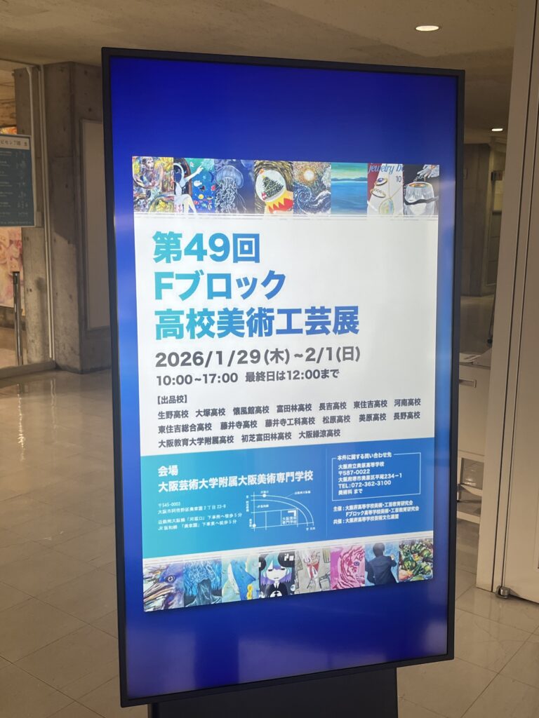 高校美術工芸展 1月29日(木)から2月1日(日)の日程で、第49回Fブロック高校美術工芸展が大阪芸術大学附属大阪美術専門学校で開催しているとのことなのでお邪魔しました。大塚高校からは美術部の作品に加え、生徒たちが授業で作成した作品も出展していました♪ どの作品も思いの詰まった力作ばかり! 元気をもらいました! 投稿ナビゲーション 美術の選択授業にお邪魔しました♪