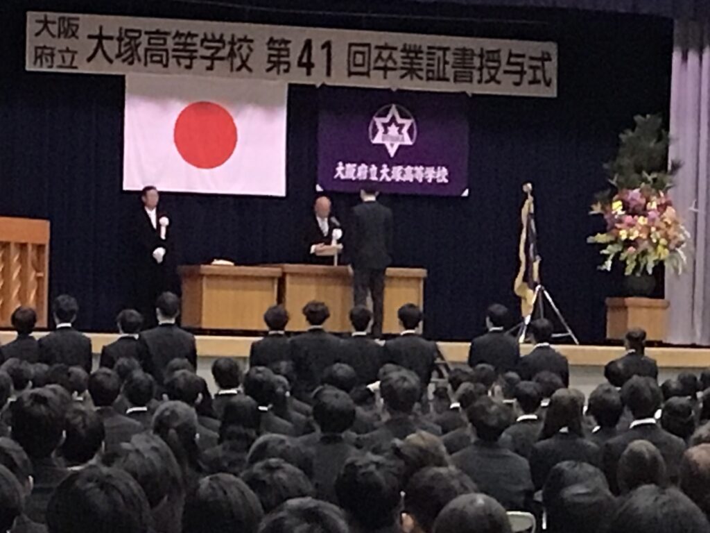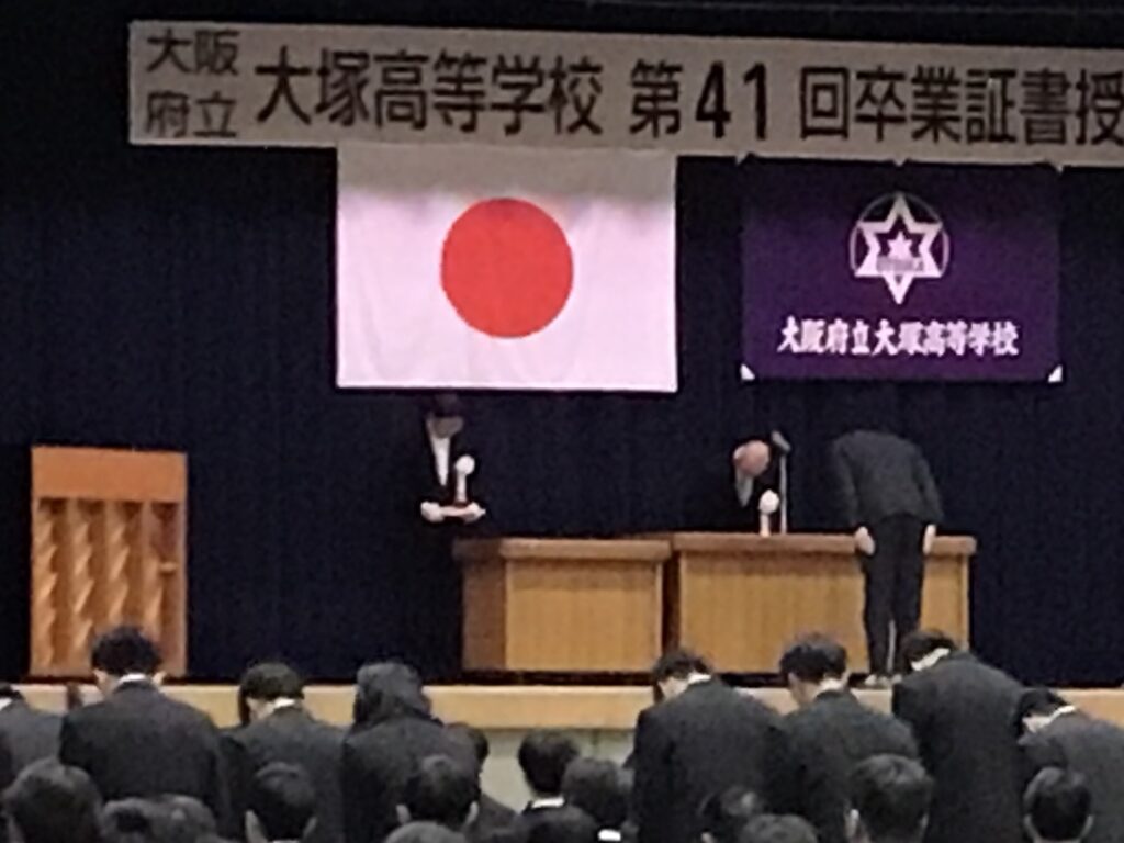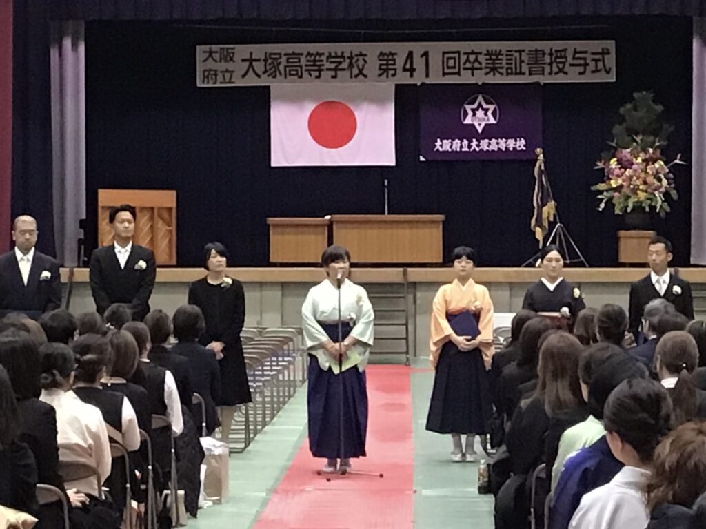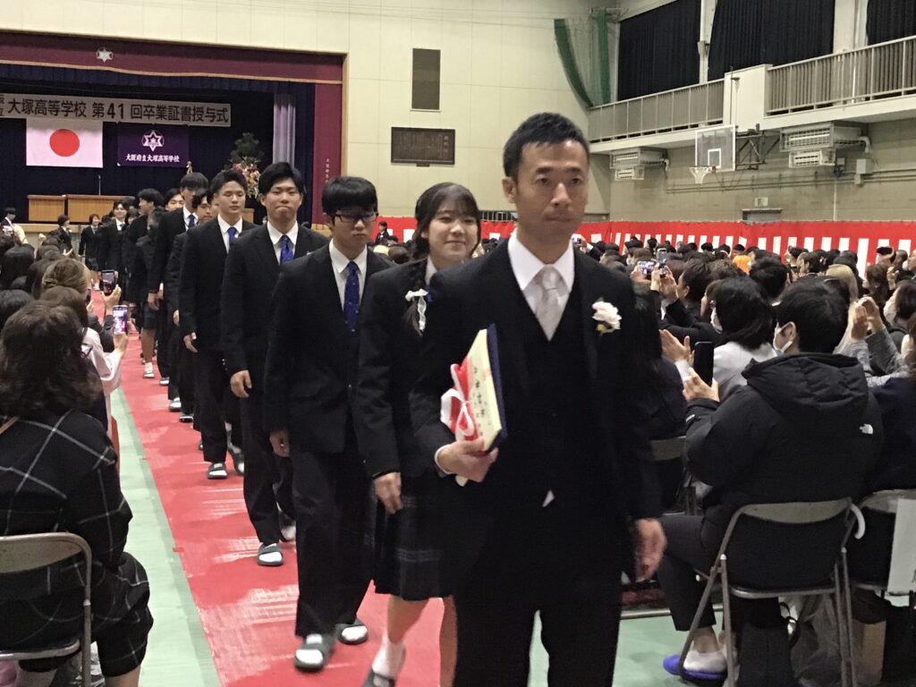 3月3日(火)、3年生(41期)の卒業式が行われました。226名の生徒が大塚を巣立っていきました。私にとっては大塚高校の教員として、卒業生を送ってから20年ぶりの卒業式で、大きな声で校歌を歌う生徒たちの姿に、20年前の卒業式の風景が蘇り、涙が溢れました。卒業生のみなさん、これからの人生、いろんなことがあると思いますが、自分に矢印を向け、「置かれたところ」で大きな花を咲かせてください。 41期生の今後の活躍を期待しています!